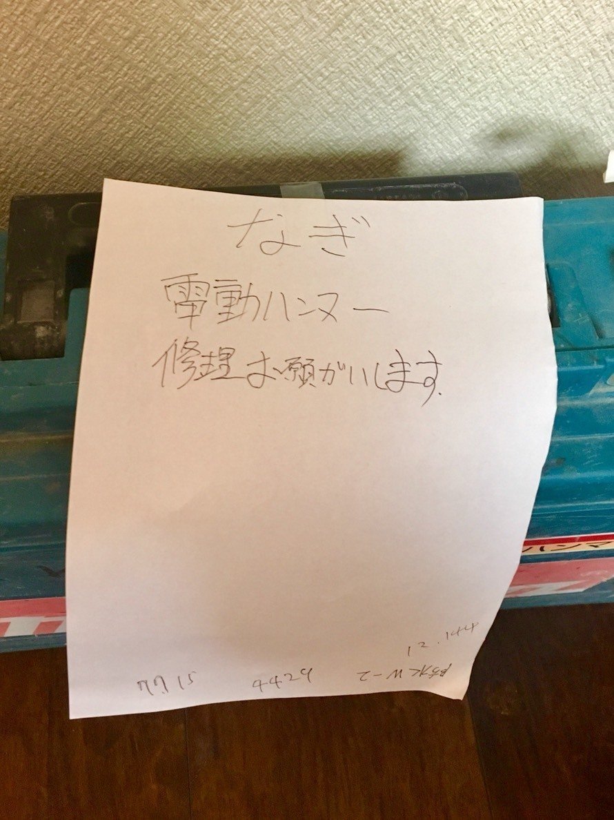 朝、事務所に来たら…電動ハンヌー修理お願い致します。って!朝から笑わしてくれた徳さんに感謝★